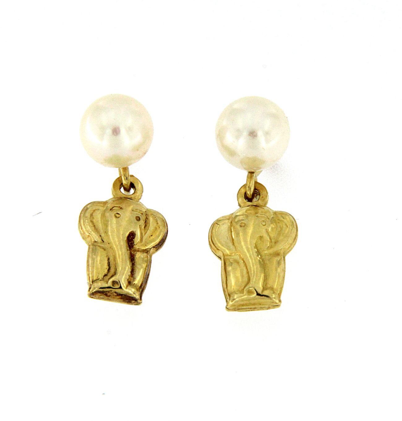 Orecchini con perla in oro giallo 18kt con ciondolino elefante lunghezza 1,7cm . Chiusura a farfallina.
