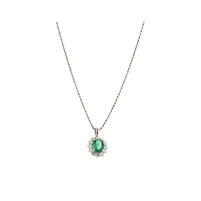 Collana in oro bianco 18 kt con ciondolo smeraldo taglio ovale ct 1,31, contornato da diamanti taglio brillante ct 0,60. Chiusura a moschettone.