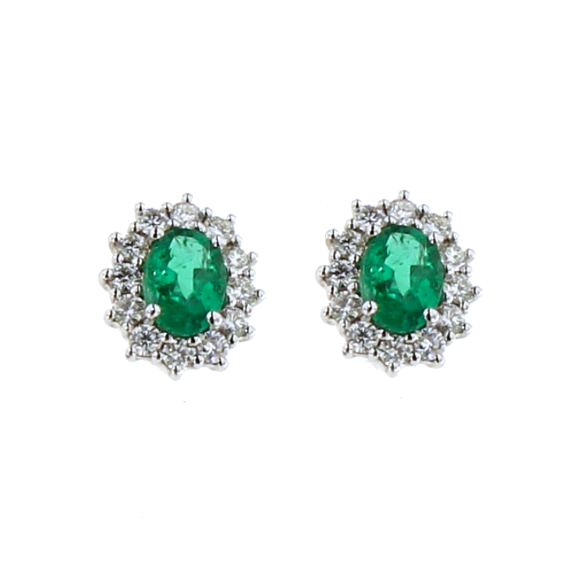 Orecchini punto luce in oro bianco 18kt con smeraldi centrali taglio ovale ct. 1.41, contornati da diamanti taglio brillante ct. 0.70.