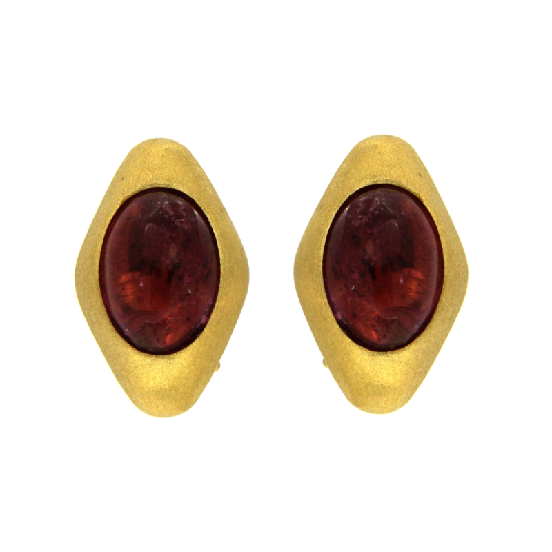 Orecchini con pietra rosa in oro giallo 18kt con pietra,larghezza 1.5cm, altezza 2.5cm, spessore 1cm. Chiusura a clips.