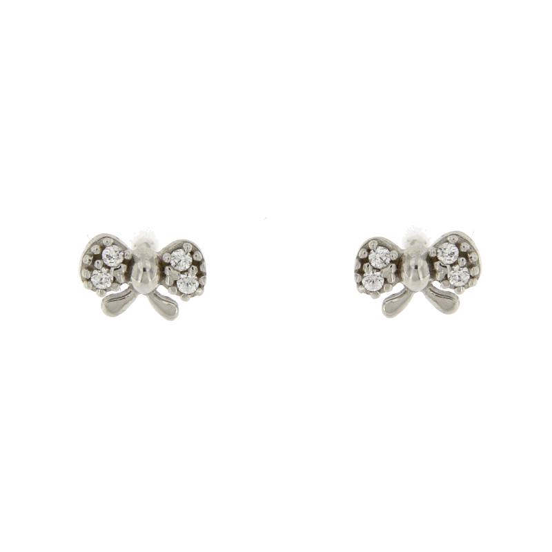 Orecchini con fiocco in oro bianco 18kt con zirconi a forma di fiocco larghezza cm 0,6.Chiusura con farfallina.