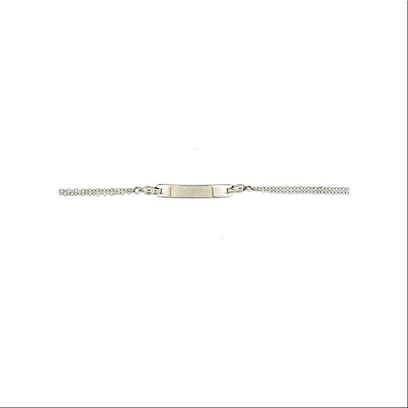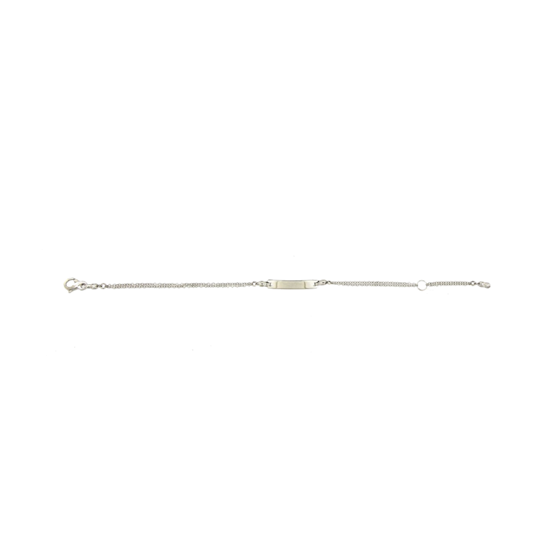 Bracciale in oro bianco 18kt con doppia catena e con targhetta 2cm, Chiusura a moschettone con misura regolabile a 15 cm o 17cm